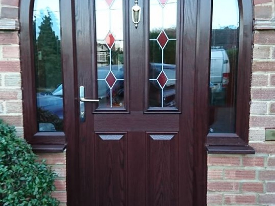 A Composite Door in an Arched Frame. Rosewood colour with gold furniture and red diamond glass. Fitted in Moulton, Northampton.