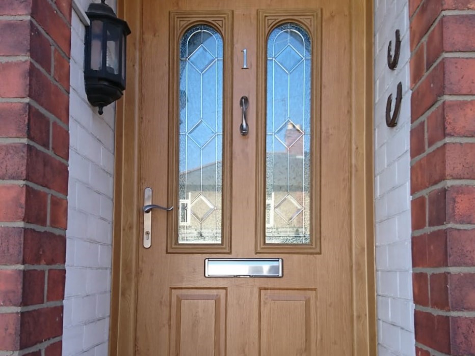 Installed in Wellingborough this week. Solidor's Nottingham style. Irish Oak Slab and Frame, Simplicity Triple Glazed Glass Design, Graphite Scrolled Handle and Letterplate and a Graphite Doctor Knocker.