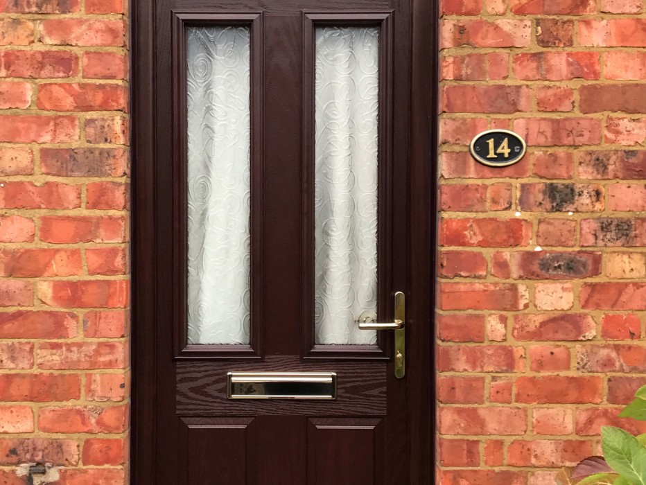 Rosewood Composite Door and Top Light in Obscure Glass with Gold Handle and Gold Letter Plate. We install double glazing, conservatories and composite doors in Rushden, Wellingborough, Earbls Barton, Bedford, Sharnbrook, Thurleigh, Milton Keynes, Northampton, Olney, Sywell and all surrounding villages.