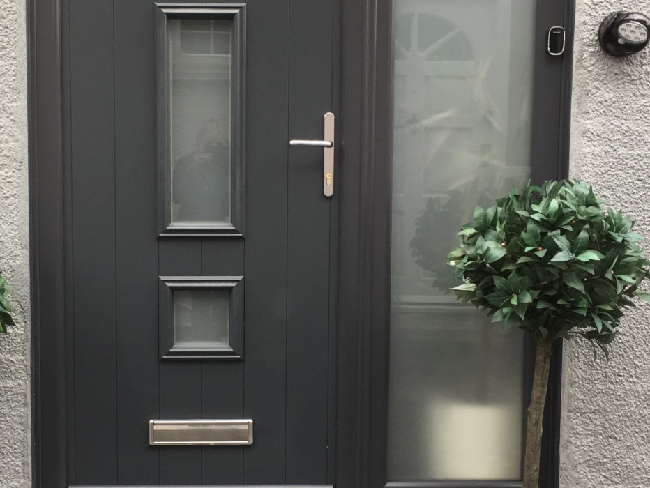 Grey on White Genoa Grooved Composite Door with Satin Glass and Graphite furniture.
